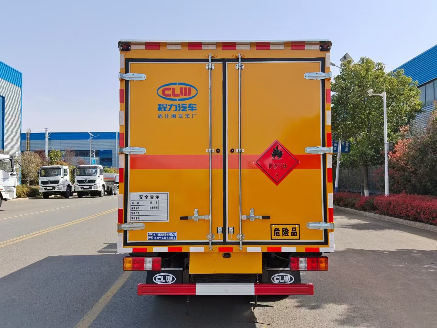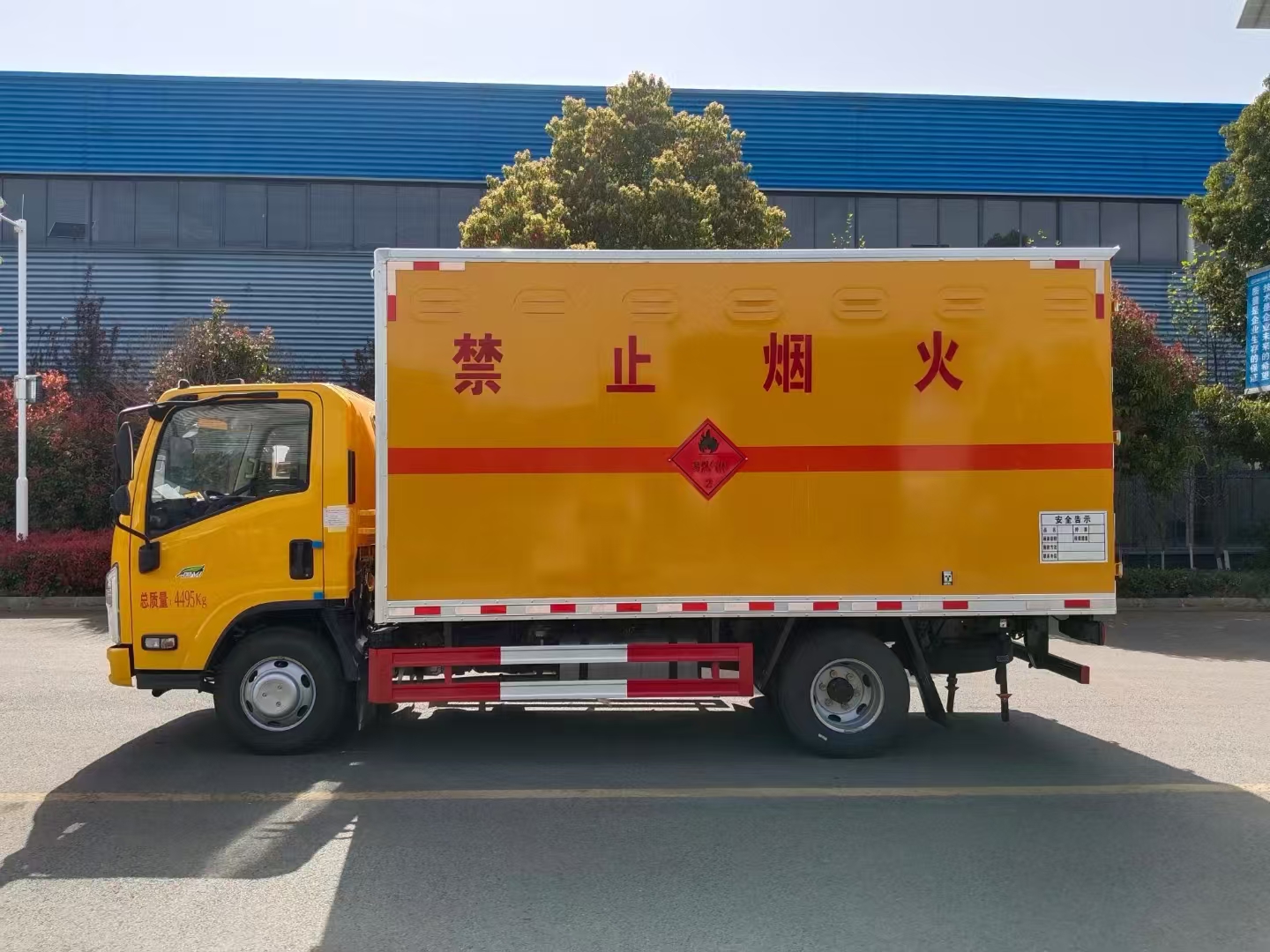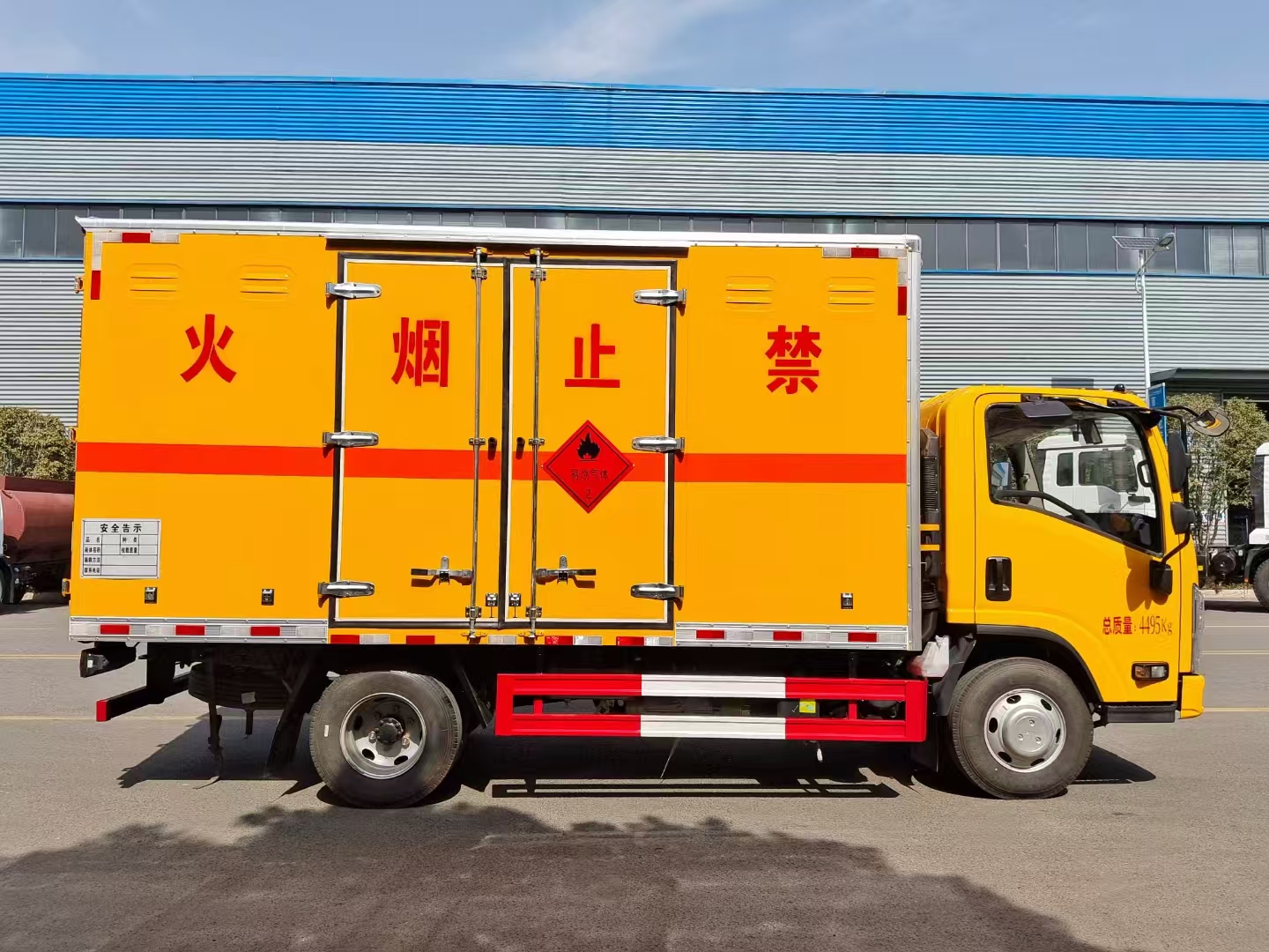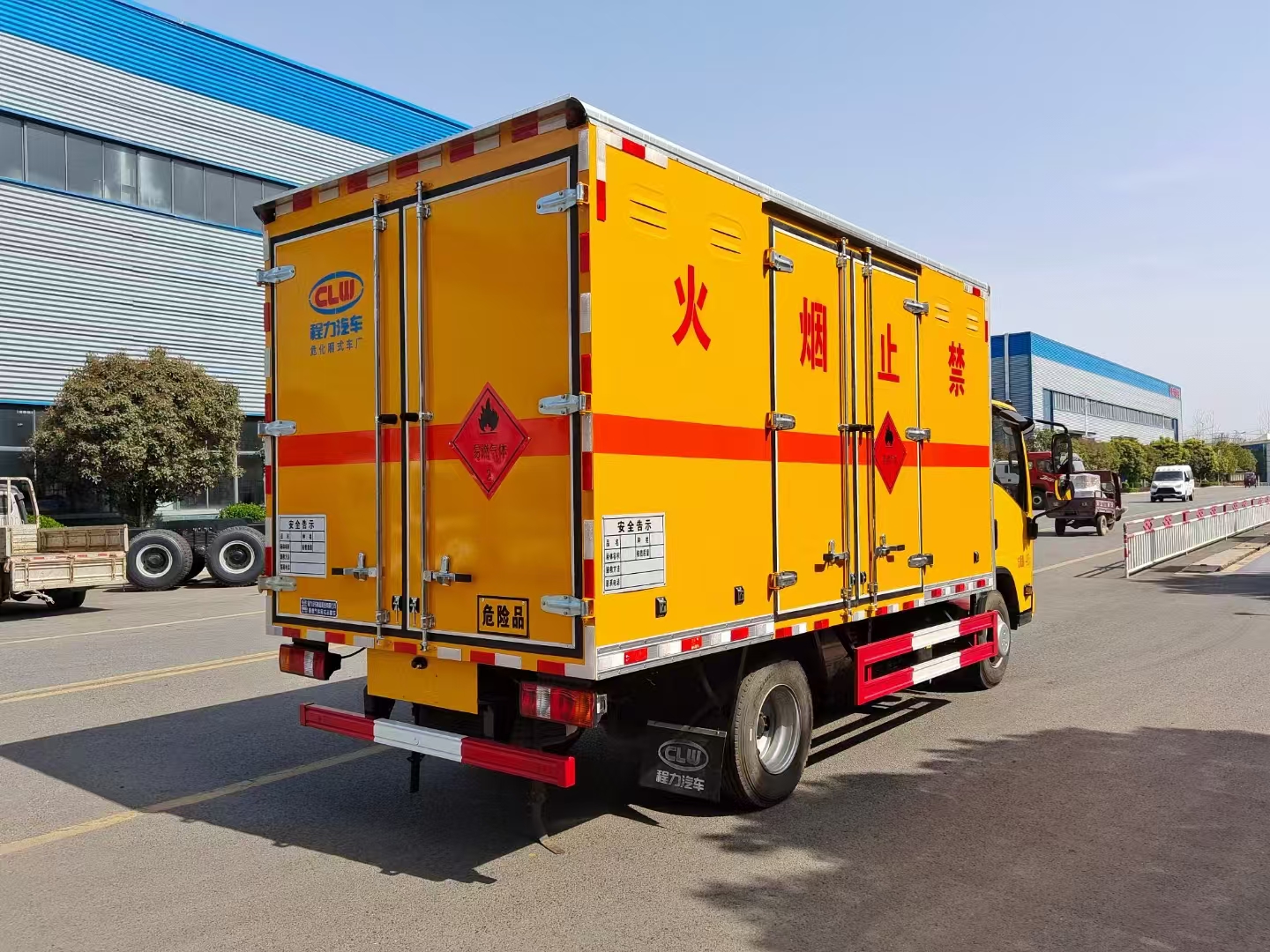 貨箱配置 廂體為雙層金屬骨架結(jié)構(gòu),外板采用冷軋鋼板,中間填充阻燃泡沫,內(nèi)飾為鋁板。底板為平板上鋪防靜電膠皮。廂內(nèi)兩側(cè)加裝固定貨物臥環(huán),門框帶防盜報(bào)警器,頂部帶煙霧報(bào)警器,廂體右側(cè)選裝側(cè)門,隨車配2個(gè)滅火器,危險(xiǎn)標(biāo)志牌,防火帽,危險(xiǎn)品三角頂燈。 (選裝瓦楞板貨箱) (尾部可選裝液壓升降尾板)